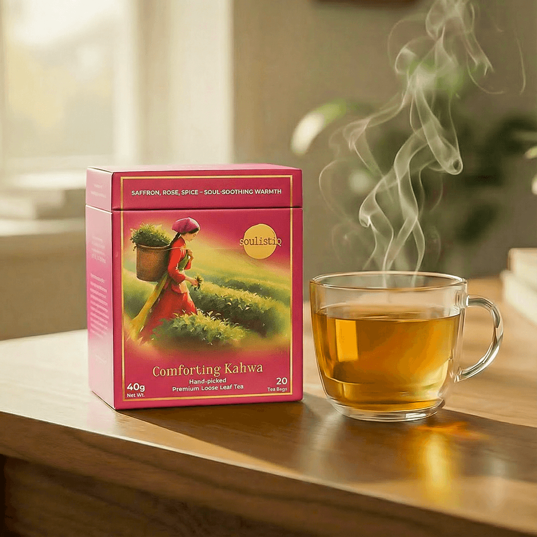 Inspired by the cherished Kashmiri tradition, Comforting Kahwa is a soul-soothing blend of Green tea infused with warming spices and fragrant botanicals. Each tea bag delivers a beautifully balanced cup layered with Cinnamon, Cloves, Cardamom, and a gentle touch of Rose, crowned with golden strands of Saffron.